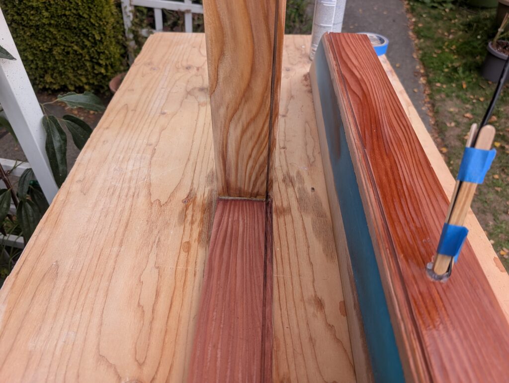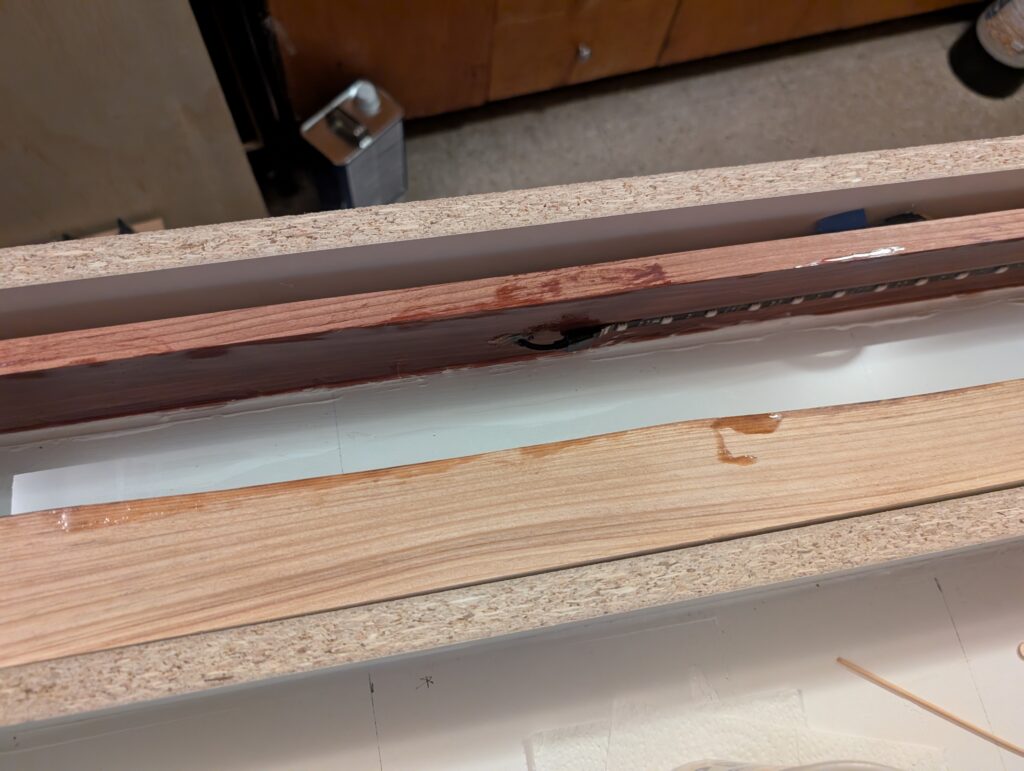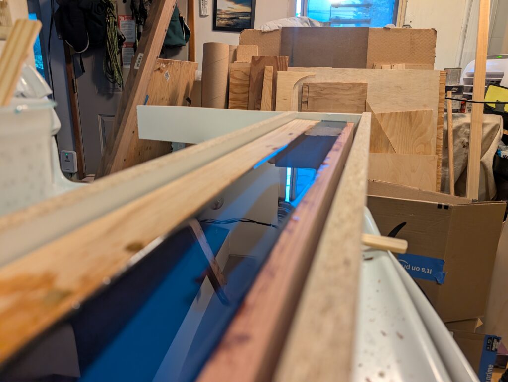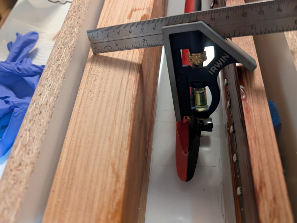 I did a test fit, and traced out the spot for the backing. I had just barely not enough redwood for it, so I ended up using a piece of 1/4 plywood and painting it white. It will almost never be visible, so that’s fine. I didn’t take any photos, but imagine a white triangle. With that done, I measured the depth of the slots for the acrylic. I added that amount all around the backing then cut the acrylic to that. I did a test fit again. It took some wiggling, but I got everything in place.