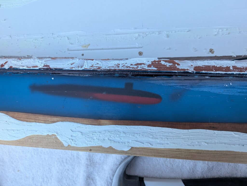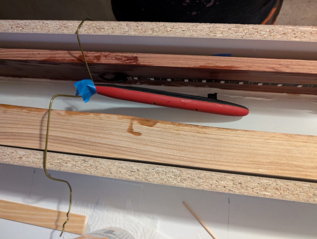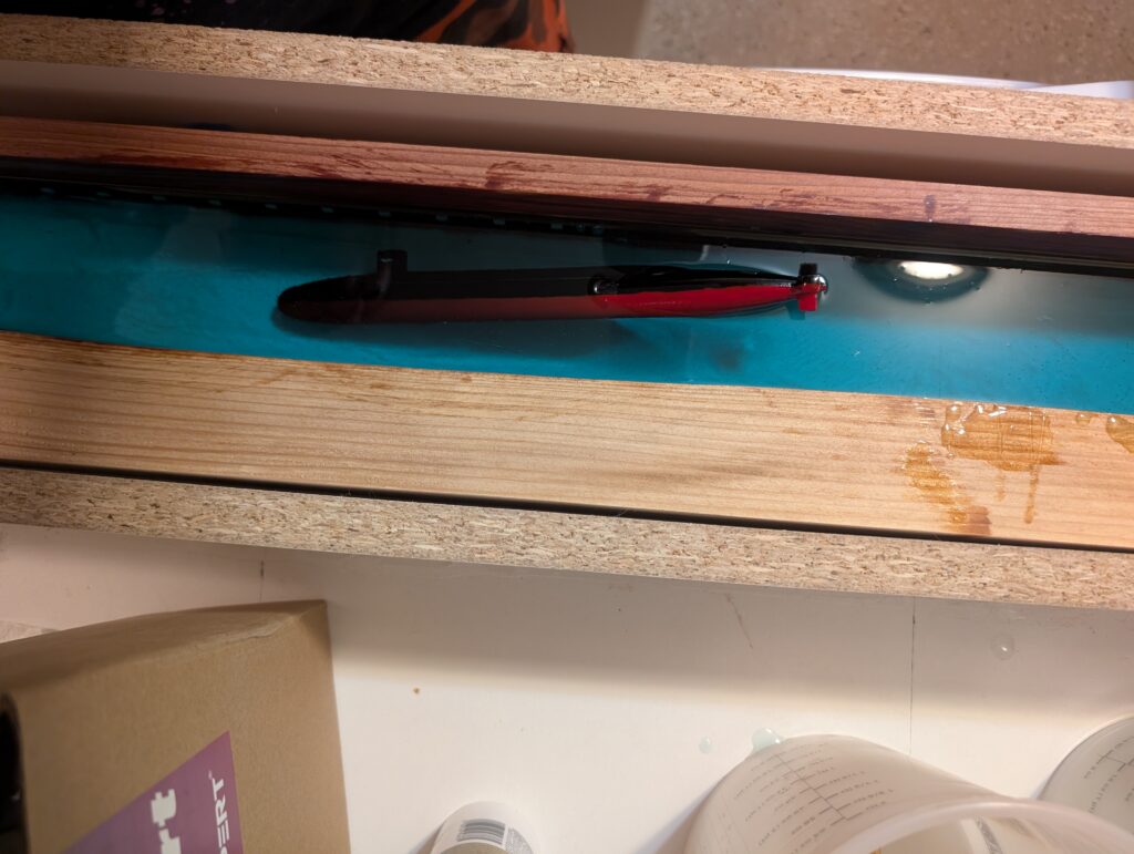 I made a mistake at this point, but I didn’t realize it until I had poured the first layer of epoxy. I put the slot side on the bottom of the mold instead of the top. That wasn’t a super big deal, but it meant I had to remember that the top of the mold was the BACK of the flag display now. I poured one layer of clear epoxy that was maybe 1/4 inch thick. That was mainly just to hold everything together, and make sure the submarine didn’t poke out when it came to sanding later. Once that was cured, I added the submarine. I wanted it to be on an angle, so it looked like the sub was coming towards you. I had to get creative with that. I used an old hanger to hold the aft up. But the submarine kept floating to the top of the epoxy. I guess it really was a submarine. I used a square to hold the bow into the epoxy. I think this layer was an inch thick. It held the sub in place.