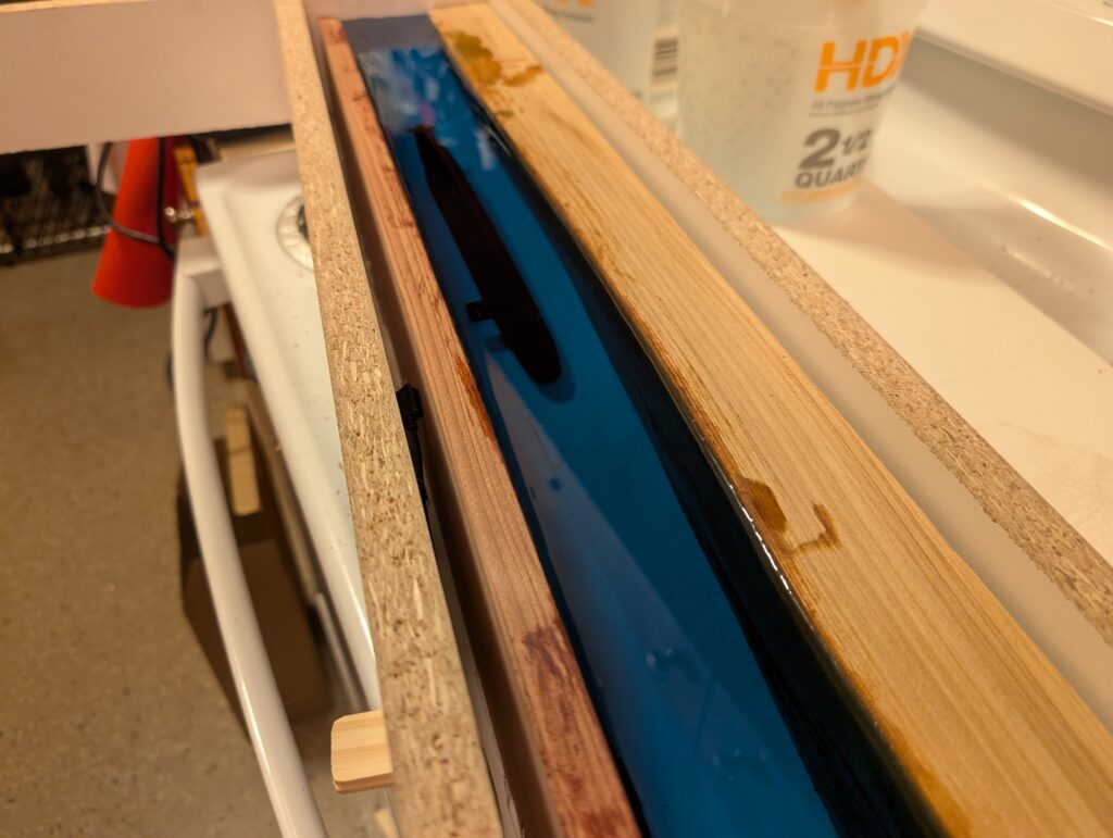 I picked the two prettiest pieces. They’ll be the outside edges. The third one will be the… ummm… “sky?” of the epoxy. I drilled a hole in that one to fit an LED connector. I built a mold out of melamine. I didn’t take any pictures of this, but it’s just a box that epoxy won’t stick to. I used silicone to hold the wood in place and to prevent leaks.