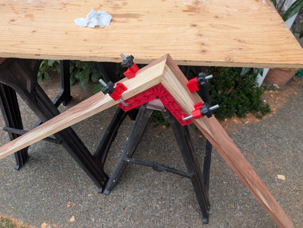 Next up, it was time for the upper triangle. I sanded them up to 400 grit, and then cut some 45 miters on them. Gluing them together was actually more frustrating than you’d expect. Originally I tried epoxy. But the wood soaked up most of it, so the bond didn’t work. I tried again, but with some gorilla glue in spots. That lasted like a week, and then when I brought it outside for sanding, it came apart. Finally, I cut the old corner off, and gave myself a fresh miter. Then I used good old fashioned wood glue. That worked perfectly. Keep it simple, stupid. Also, corner clamps are awesome.