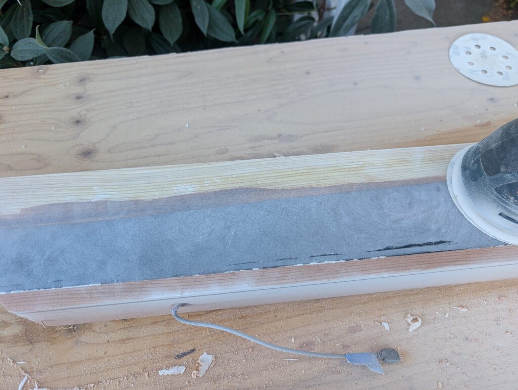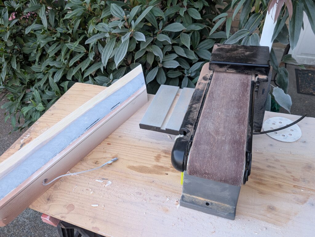 Once that was cured, I pulled it out of the mold, and began sanding. Well, first I had to remove all the silicone. Then lots and lots of sanding. So much sanding. Even though the mold was level, the wood wasn’t, so I had high and low spots. It wasn’t worth the money to go back to IsGood to go back through the wide belt sander, so I did it myself. I did try using my tabletop sander, but it was difficult. I wouldn’t be able to see what I was sanding, plus the wood and epoxy at this point weigh like 15 lbs.