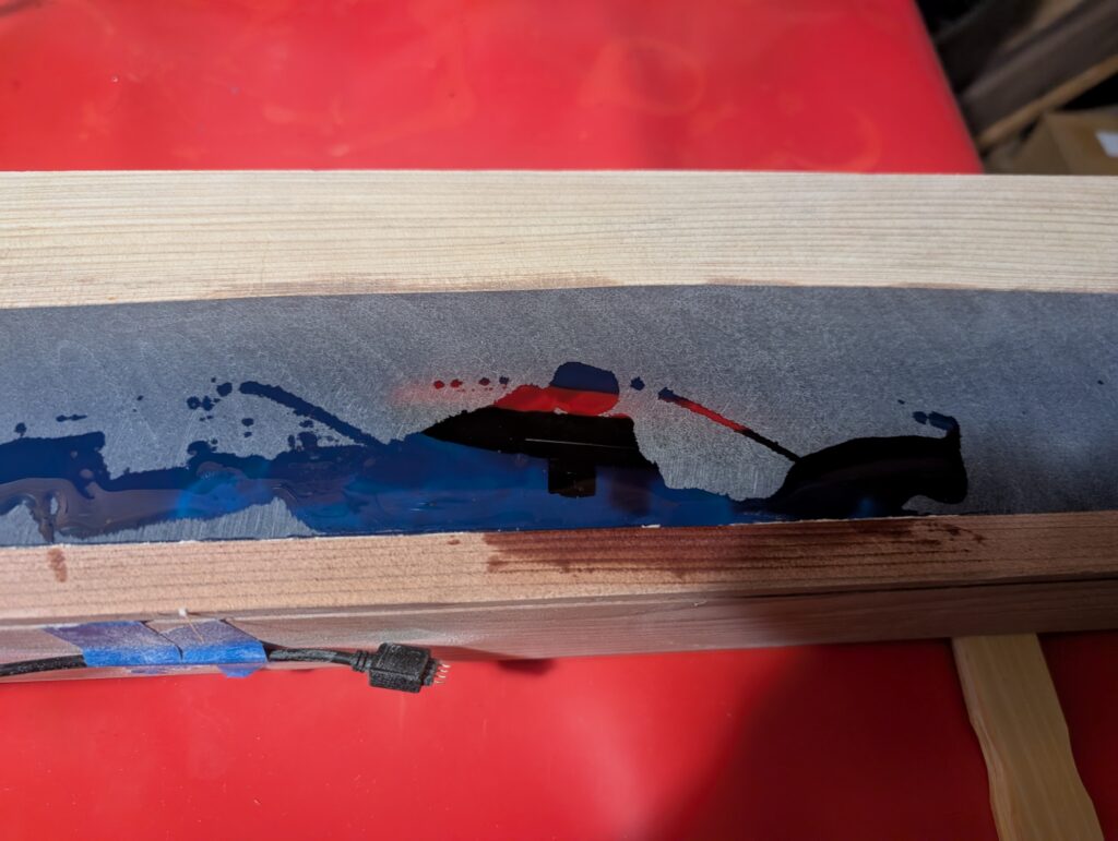 Once that was cured, I removed the hanger and square and then started adding layers of blue epoxy. The dye I got was very powerful, so it was like 2 drops for 52 oz of epoxy.