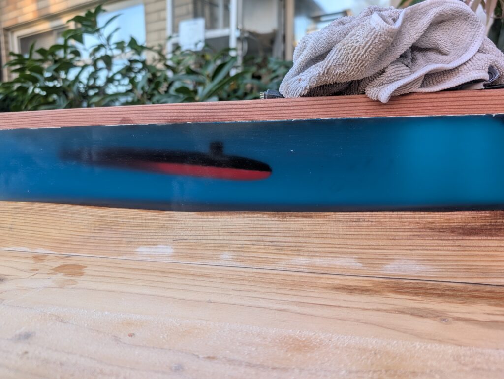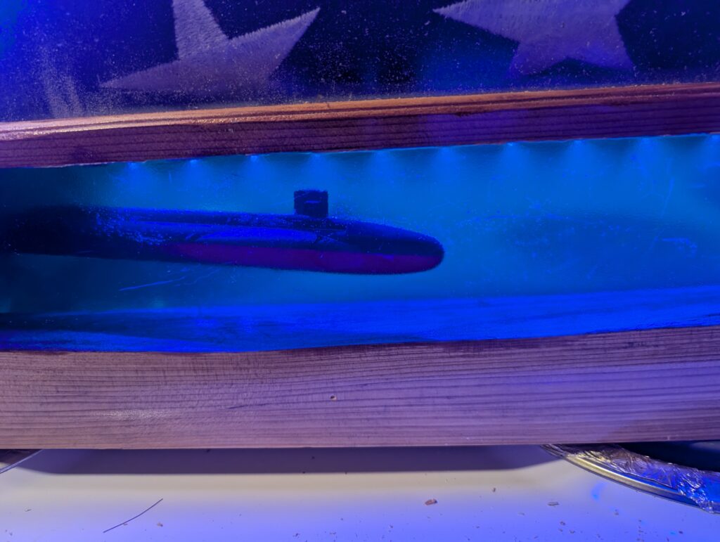 A few years ago, he died from cancer, way too young. I wanted to do something to memorialize him. I’m ok at woodworking, and I’m very used to working with epoxy, so I decided to make a flag display. To make it special, my fake mom gave me a miniature model of his old submarine that he made and painted. I inlaid that in epoxy as the base of the flag display. I’d use the live edge of the wood to look like the ocean floor.