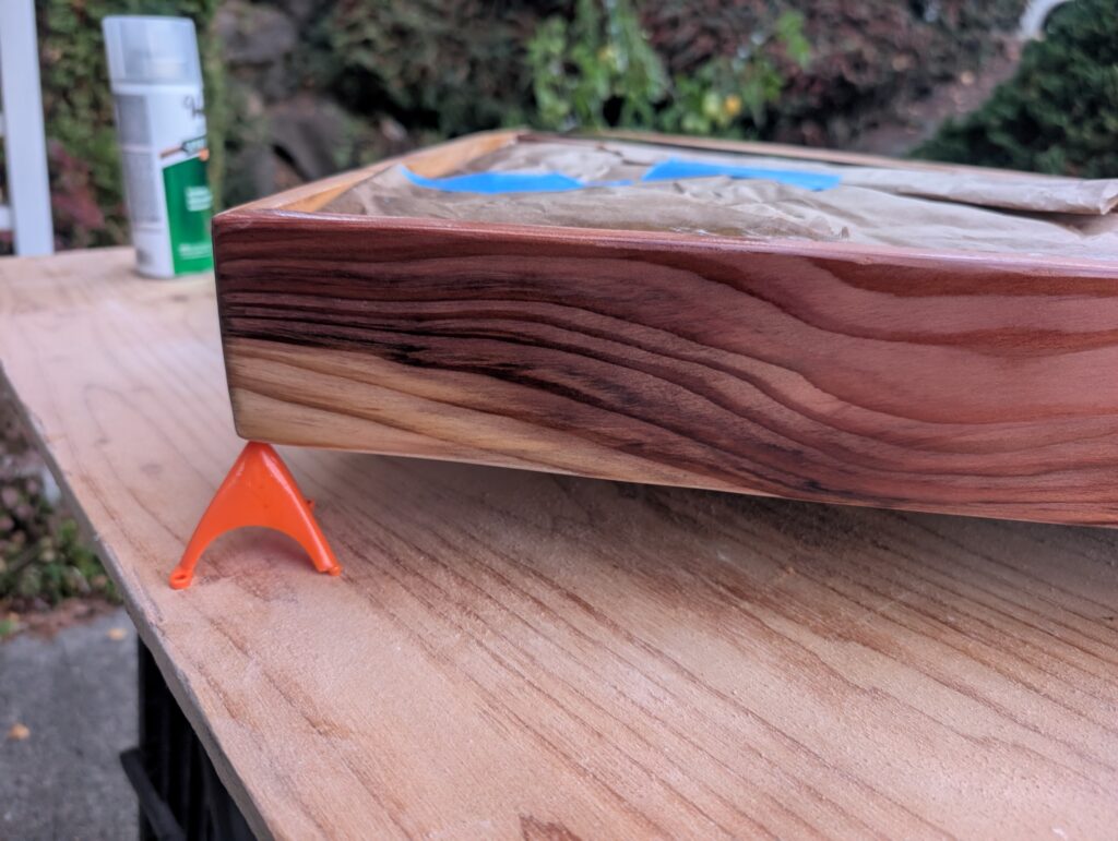 Once it was finally secure, I gave everything a very small 1/8 inch roundover. This wasn’t a great idea, because the redwood is a very soft wood, and it caused some chipout. I sanded the inside and the top of the base, to 600 grit. I figured it’d be smarter to finish the inside now, while it’s still apart. Like the coffee table, I’m using Spar Urethane varnish, but this time, I decided to give the spray version a try. It’s so much easier to work with. I was able to apply 3 thin coats each day. No runs. No bubbles. Easy. So I did that for the inside, where the flag will be, because once I put it together, it would be super difficult. I did have to keep the LED cable out of the way, so I wrapped it in popsicle sticks, to make it “stick” up. This worked surprisingly well.