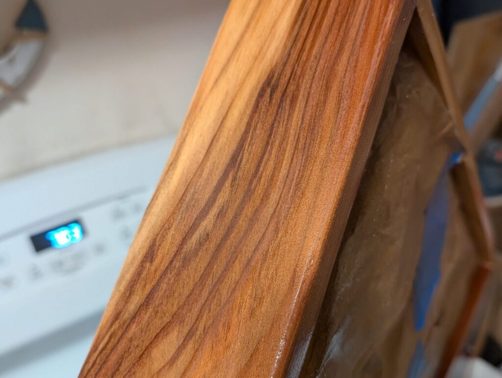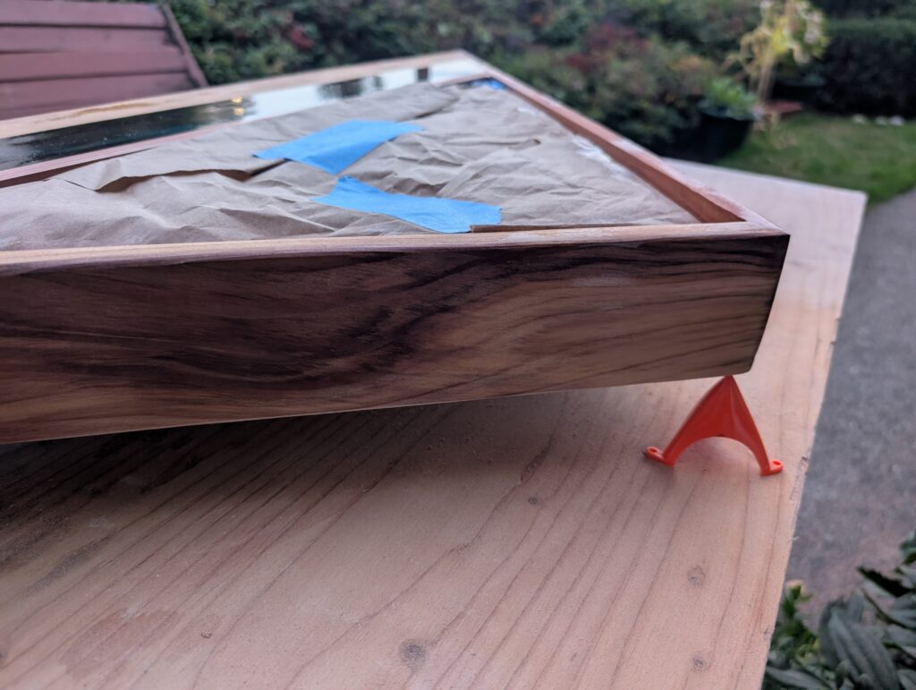 Time for final sanding. I got everything up to 600 grit. I rounded over the outer edges and the top corner. I kept the bottom edges straight, because I thought they looked better. I used the white backing (wrapped in paper) to fill the area so I didn’t get varnish on the acrylic. Then I started applying varnish. It was at this point that I started getting proud of my work. I mean, look at that wood. These photos are after the first coat. I started with the back, so if I messed up, I’d be able to fix it, or it would be hidden. But everything turned out so well. I did 6 or 7 coats on the back and sides. Then I flipped it over and did the same on the front.
