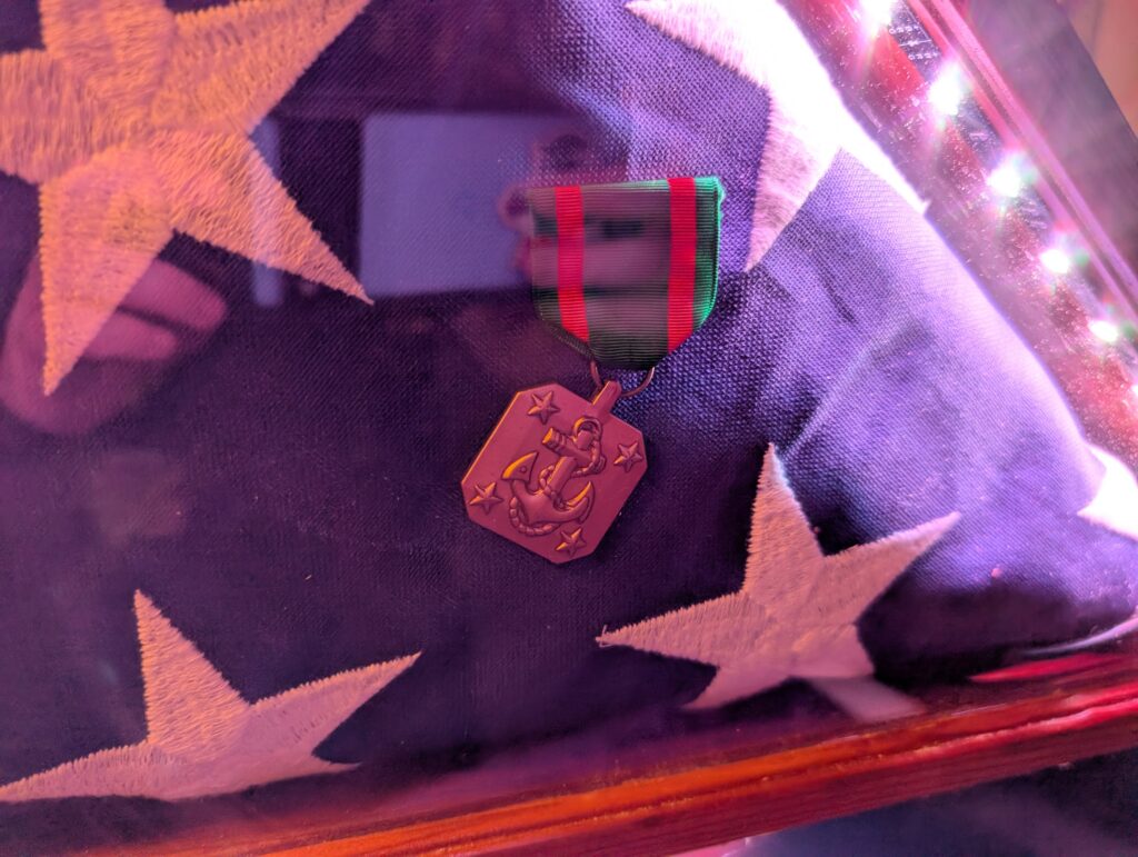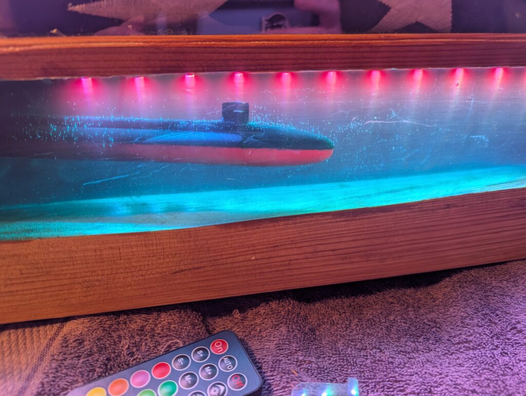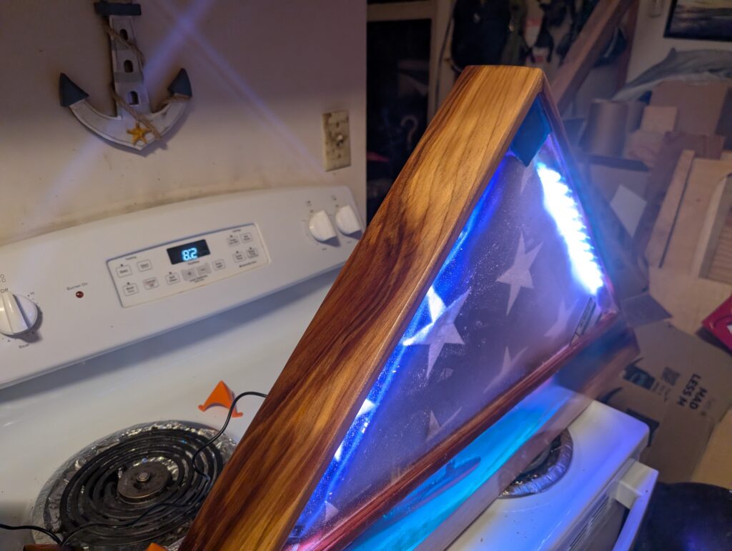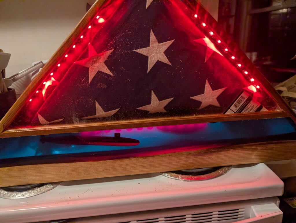 My fake dad had earned a medal, so I pinned that to the flag, and hot glued some of the bullets from the 21 gun salute. Obviously, I also put the flag in. The pin got sort of on an angle, so I had to take the back off again, and fix it. There are like 10 screws holding it in place, so that was fun. The LEDs are color changeable via a remote. I wish they weren’t so focused. Maybe I’ll add some sort of diffuser later. I can’t do that with the one in the “ocean” because of the epoxy, but that one’s not as noticeable.